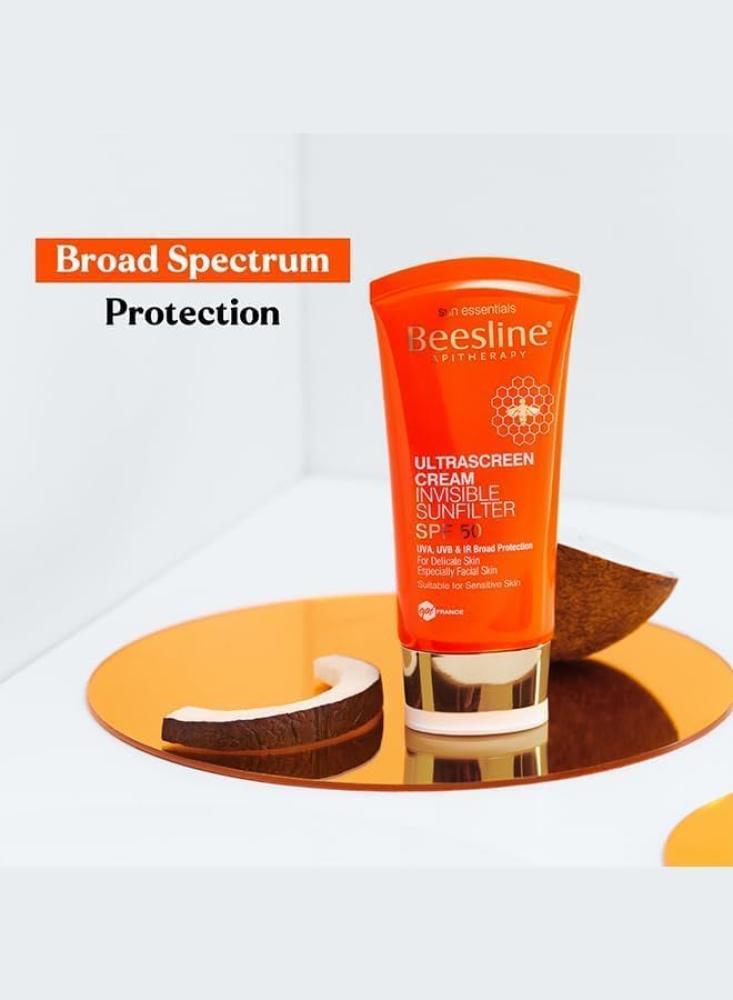 كريم واقي الشمس من بيزلين سونفلتر Beesline Ultrascreen Cream Invisible Sunfilter SPF50 هو واقي شمسي هجين يجمع بين الحماية المعدنية غير النانوية والحماية العضوية (الكيميائية) للحماية من أشعة UVA وUVB والأشعة تحت الحمراء. غني بمزيج من الزيوت الثمينة وشمع العسل. يمنع الجفاف، ويترك البشرة ناعمة ومرنة. يجعله ملمسه غير المرئي وغير اللامع مثالياً للتطبيق تحت المكياج.